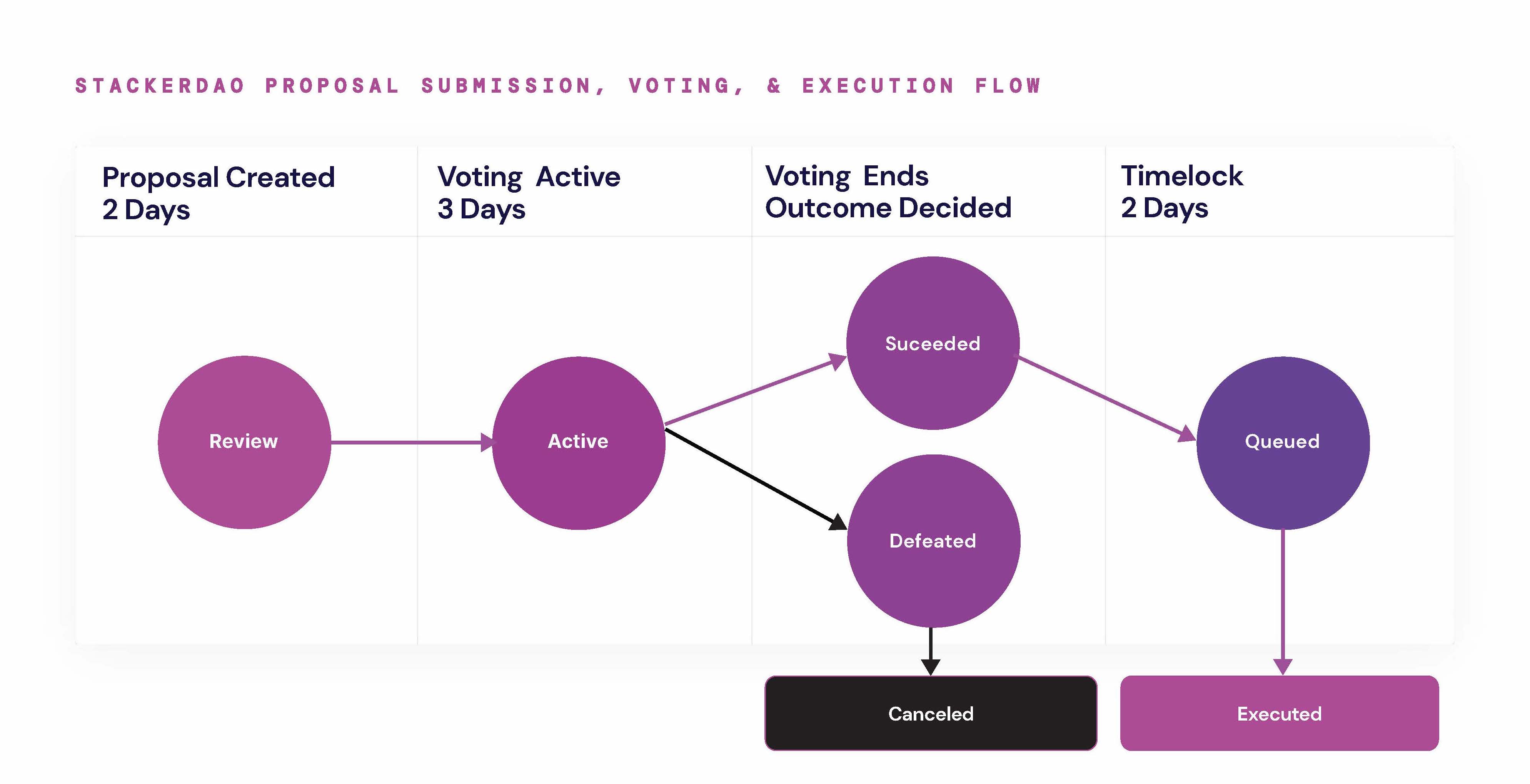 <figure><img src="https://3255197333-files.gitbook.io/~/files/v0/b/gitbook-x-prod.appspot.com/o/spaces%2Fvbr3KlZoYp0ww4fETcBX%2Fuploads%2FDpFY3BuQs0zgViXS6U8m%2FStackerDAO%20Labs%20-%20Charts%20and%20Assets_Page_2.jpg?alt=media&#x26;token=a9183f5a-f1aa-4467-9bcd-1e5affb906ec" alt=""><figcaption><p><em>An overview of the proposal submission and voting process from submission to execution. All of these days are customizable. We suggest a 7 day period from proposal submission to execution using the days displayed in this chart. However, each StackerDAO founder should consider their DAO's needs to determine what lengths are optimal for their DAO's use case.</em></p></figcaption></figure>
